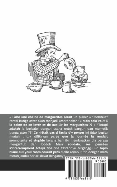 Faire une chaîne de marguerites serait un plaisir "Membuat rantai bunga aster akan menjadi keseronokan" Mais cela vaut-il la peine de se lever et de cueillir les marguerites "Tetapi adakah ia berbaloi dengan usaha untuk bangun dan memetik bunga aster " Ce n'était pas si facile d'y penser Ini tidak begitu mudah untuk difikirkan parce que la journée la rendait somnolente et stupide kerana hari itu membuatkan dia berasa mengantuk dan bodoh Mais soudain, ses pensées s'interrompirent tetapi tiba-tiba fikirannya terganggu un lapin blanc aux yeux roses courait près d'elle Arnab Putih dengan mata merah jambu berlari dekat dengannya Il n'y avait rien de trop remarquable chez le lapin Tidak ada yang terlalu luar biasa tentang arnab itu et Alice ne trouvait pas non plus le lapin remarquable dan Alice juga tidak menganggap arnab itu luar biasa elle ne s'étonna pas non plus quand le Lapin parla juga tidak mengejutkannya apabila Arnab bercakap Oh mon Dieu ! Je serai trop tard ! se dit-il "Oh sayang! Saya akan terlambat!" katanya kepada dirinya sendiri mais alors le Lapin a fait quelque chose que les lapins n'ont pas fait tetapi kemudian Arnab melakukan sesuatu yang tidak dilakukan oleh arnab le Lapin tira une montre de la poche de son gilet Arnab mengeluarkan jam tangan dari poket baju pinggangnya Il regarda l'heure puis se hâta Dia melihat masa dan kemudian bergegas
