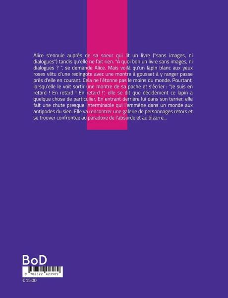 Alice s'ennuie auprès de sa soeur qui lit un livre ("sans images, ni dialogues") tandis qu'elle ne fait rien. "À quoi bon un livre sans images, ni dialogues ? ", se demande Alice. Mais voilà qu'un lapin blanc aux yeux roses vêtu d'une redingote avec une montre à gousset à y ranger passe près d'elle en courant. Cela ne l'étonne pas le moins du monde. Pourtant, lorsqu'elle le voit sortir une montre de sa poche et s'écrier : "Je suis en retard ! En retard ! En retard !", elle se dit que décidément ce lapin a quelque chose de particulier. En entrant derrière lui dans son terrier, elle fait une chute presque interminable qui l'emmène dans un monde aux antipodes du sien. Elle va rencontrer une galerie de personnages retors et se trouver confrontée au paradoxe de l'absurde et au bizarre...