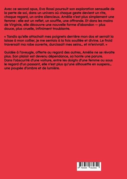 Avec ce second opus, Eva Rossi poursuit son exploration sensuelle de la perte de soi, dans un univers où chaque geste devient un rite, chaque regard, un ordre silencieux. Amélie n'est plus simplement une femme : elle est un reflet, un souffle, une offrande. Et dans les mains de Virginie, elle découvre une nouvelle forme d'abandon - plus douce, plus cruelle, infiniment troublante.« Tandis qu'elle attachait mes poignets derrière mon dos et serrait la laisse à mon collier, je me sentais à la fois souillée et divine. Le froid traversait ma robe ouverte, durcissait mes seins... et m'enivrait. »Guidée à l'aveugle, offerte au regard des autres, Amélie ne se révolte plus. Son plaisir est devenu dépendance, sa honte une parure.Dans l'obscurité d'une voiture, entre les doigts d'une femme ou sous le regard d'un passant, elle n'est plus qu'une silhouette en suspens... une poupée d'ombre et de lumière.