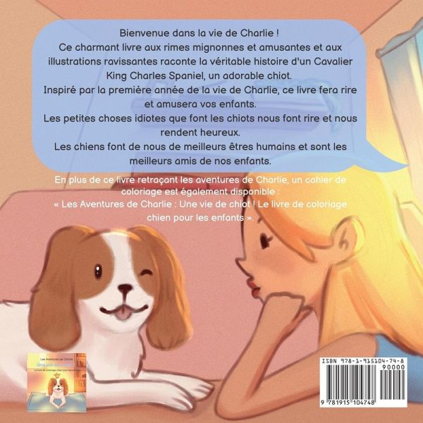 Les aventures de Charlie : Une vie de chiot ! est un conte raconté par un Cavalier King Charles Spaniel. Bienvenue dans son univers dépeint en images dans ce charmant livre qui retrace la véritable histoire rythmée de cet adorable chien. Inspiré de faits réels de la première année de Charlie, ce livre propose aux enfants un regard tendre et affectueux sur les chiens et plus encore sur tous les animaux de la terre. ¿¿¿¿¿¿Drôle, coloré et trop mignon ! Suivez les merveilleuses aventures de Charlie qui dépeint la délicieuse relation entre un chiot et son maître. ¿¿¿¿¿Un Cadeau parfait pour vos enfants Votre enfant aime les animaux ? Vous souhaitez lui offrir un cadeau d'anniversaire qui sort de l'ordinaire ? Voulez-vous planter des graines qui se transformeront en amour et en gentillesse pour nos amis les bêtes ? Alors, ce livre est fait pour vous et votre enfant. Les enfants tomberont amoureux de Charlie - et vous aussi ! ¿¿¿¿Profitez de cette parenthèse enchantée de gentillesse, d'attention et d'amour pour nos animaux de compagnie. ¿¿¿En plus de ce livre retraçant les aventures de Charlie, un cahier de coloriage est également disponible : Les Aventures de Charlie : Une vie de chiot ! Le livre de coloriage chien pour les enfants . ¿¿Mentions :Facile à lire et illustré - Pour tous les enfants, petits et grands ! Conseillé de 6 à 8 ans pour la lecture. À lire par les parents et grands-parents, aux nouveau-nés et aux très jeunes enfants. À mettre dans tous les cartables des cours de récré et de jardins d'enfants. Les adolescents et les adultes apprécieront également les aventures de Charlie, cette histoire sur la gentillesse et l'amour que nous devons offrir à nos animaux de compagnie. Les dimensions du livre sont de 21,59 × 21,59 cm, 36 pages. Couleur haute définition sur papier glacé blanc.
