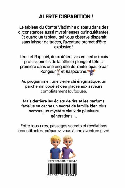 Plongez dans l'univers fascinant de "Le tableau du Comte Vladimir", où mystère et humour s'entrelacent dans une enquête palpitante ! Lorsque le célèbre tableau du Comte disparaît dans des circonstances troublantes, deux détectives amateurs-Léon et Raphaël-s'engagent sur la voie de l'intrigue. Avec l'aide de leurs amis excentriques, Rongeur et Raspoutine, ils découvrent une vieille clé mystérieuse et un parchemin codé, tout en se régalant de glaces aux saveurs aussi loufoques qu'irrésistibles. Mais derrière les rires et les surprises, un secret de famille sombre menace d'éclater. Entre passages secrets et révélations inattendues, préparez-vous à une aventure pleine de rebondissements et d'émotions. Ce livre promet une lecture captivante pour les amateurs de mystères et d'humour décalé ! Ne manquez pas ce voyage épique au coeur de l'intrigue
