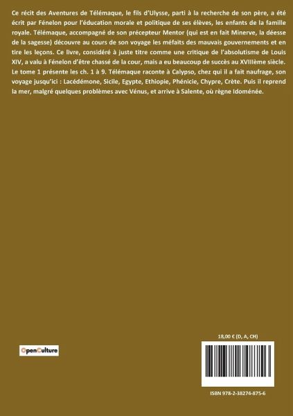 "Les aventures de Télémaque" est une uvre littéraire qui revisite le mythe classique de Télémaque, fils d'Ulysse, à travers une perspective moderne et surréaliste. Le récit commence avec Télémaque échouant sur l'île d'Ogygie, où il rencontre la déesse Calypso et ses nymphes. Mentor, son guide, l'accompagne, mais il est révélé que Mentor est en réalité Minerve déguisée. Télémaque est tiraillé entre son désir de retrouver son père et les tentations de l'île. Calypso lui offre l'immortalité et l'amour, mais Télémaque reste hanté par sa quête. Le texte explore des thèmes de l'amour, de la sagesse, et de l'identité à travers des dialogues philosophiques et des réflexions introspectives. Les personnages se livrent à des discussions sur la nature de la réalité, la perception du temps, et la quête de sens. L'uvre se distingue par son style poétique et ses digressions philosophiques, mêlant des éléments de la mythologie grecque avec des réflexions modernes sur l'existence. Le récit est ponctué de scènes oniriques et de métaphores qui enrichissent la profondeur narrative, tout en questionnant les notions de vérité et de connaissance.