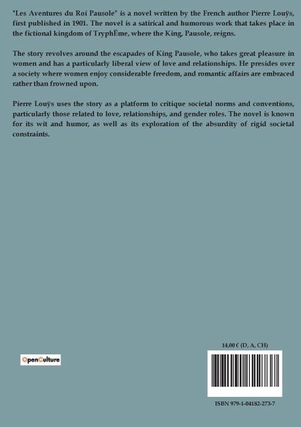 "Les Aventures du Roi Pausole" est un roman écrit par l'auteur français Pierre Louÿs, publié pour la première fois en 1901. Le roman est une ¿uvre satirique et humoristique qui se déroule dans le royaume fictif de TryphËme, où règne le roi Pausole. L'histoire tourne autour des frasques du roi Pausole, qui prend beaucoup de plaisir avec les femmes et a une vision particulièrement libérale de l'amour et des relations. Il préside une société où les femmes jouissent d'une grande liberté et où les relations amoureuses sont acceptées plutôt que désapprouvées. Pierre Louÿs se sert de cette histoire pour critiquer les normes et les conventions de la société, en particulier celles liées à l'amour, aux relations et aux rôles des hommes et des femmes. Le roman est connu pour son esprit et son humour, ainsi que pour son exploration de l'absurdité des contraintes sociétales rigides.