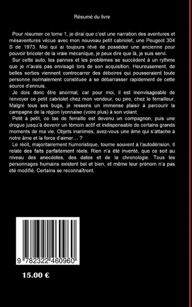 Ce livre retrace les aventures, et surtout les mésaventures, que j'ai vécues avec ma petite Peugeot 304 S cabriolet. La tournure est volontairement humoristique,même si les galères rencontrées pousseraient certains, à propulser ce petit cabriolet directement dans la presse du ferrailleur. Tout ce qui est conté est rigoureusement exact.Aucun problème n'a été inventé, même si la narration pousserait à penser le contraire.Ce tome, et les suivants, peuvent aussi servir de précis mécaniques pour les nulles ... mais pas que ...! Il vous fera aussi partager les bons moments passés aux volants de ce petit cabriolet, car il y en a, et heureusement !