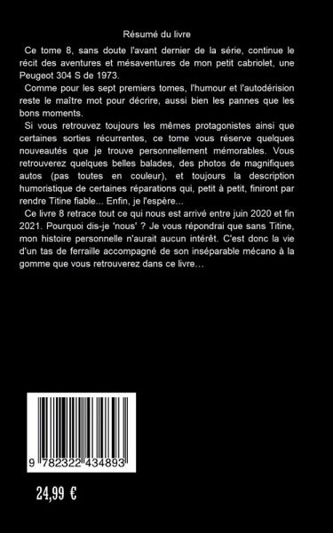 Ce tome 8, sans doute l'avant-dernier de la série, continue le récit des aventures et mésaventure de mon petit cabriolet, une Peugeot 304 S de 1973. Comme pour les sept premiers tomes, l'humour et l'autodérision restent le maître-mot pour décrire, aussi bien les pannes que les bons moments.Si vous retrouvez toujours les mêmes protagonistes ainsi que certaines sorties récurrentes, ce tome vous réserve quelques nouveautés que je trouve personnellement mémorables. Vous retrouverez quelques belles balades, des photos de magnifiques autos (pas toutes en couleurs), et toujours la description humoristique de certaines réparations qui, petit à petit, finiront par rendre Titine fiable... Enfin, je l'espère... Ce livre 8 retrace tout ce qui nous est arrivé entre le premier janvier 2020 et fin 2021. Pourquoi dis-je 'nous' ? Je vous répondrai que sans Titine, mon histoire personnelle n'aurait aucun intérêt. C'est donc la vie d'un tas de ferraille accompagné de son inséparable mécano à la manque...