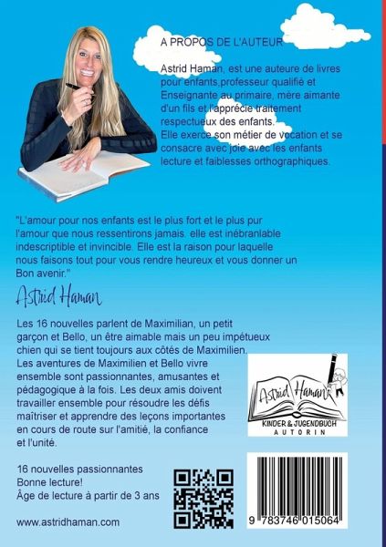 Les 16 nouvelles parlent de Maximilian, un petit garçon et Bello, un être aimable mais un peu impétueuxchien qui se tient toujours aux côtés de Maximilien.Les aventures de Maximilien et Bello vivre ensemble sont passionnantes, amusantes etpédagogique à la fois. Les deux amis doivent travailler ensemble pour résoudre les défismaîtriser et apprendre des leçons importantes en cours de route sur l'amitié, la confiance et l'unité.16 nouvelles passionnantesBonne lecture!Âge de lecture à partir de 3 answww.astridhaman.com