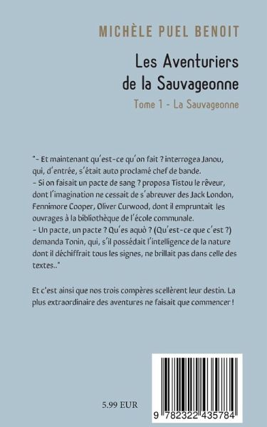"- Et maintenant qu'est-ce qu'on fait ? interrogea Janou qui, d'entrée, s'était auto proclamé chef de bande.- Si on faisait un pacte de sang ? proposa Tistou le rêveur, dont l'imagination ne cessait de s'abreuver des Jack London, Fennimore Cooper, Oliver Curwood, dont il empruntait les ouvrages à la bibliothèque de l'école communale. - Un pacte, un pacte ? Qu'es aquò ? (Qu'est-ce que c'est ?), demanda Tonin, qui, s'il possédait l'intelligence de la nature dont il déchiffrait tous les signes, ne brillait pas dans celle des textes. "Et c'est ainsi que nos trois compères scellèrent leur destin. La plus extraordinaire des aventures ne faisait que commencer !