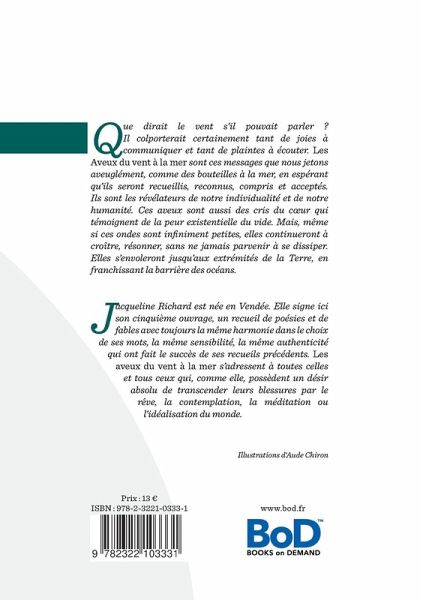 "Les aveux du vent à la mer" est un livre de poésies évoquant les cris que l'on peut envoyer à la face du vent et qui se disséminent dans l'espace. C'est un mélange hétéroclite de poèmes parfois drôles, parfois sérieux qui emporte le lecteur dans un univers haut en couleurs. L'auteure cherche à prouver ainsi que quelque soit le chemin que l'on emprunte, la vie nous enrichit par la puissance des mots, des sentiments, des émotions que l'on possède au fond de notre coeur.