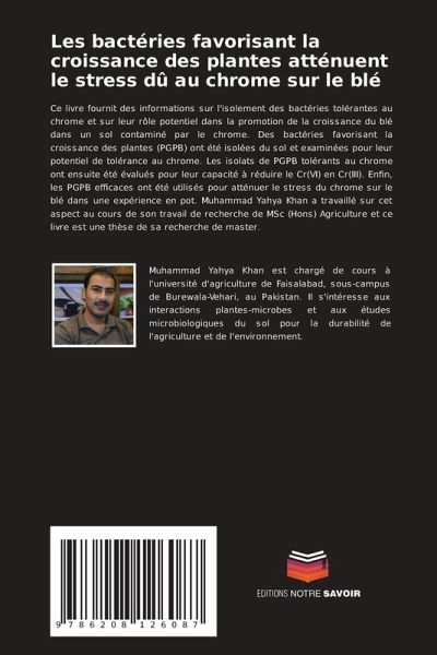 Ce livre fournit des informations sur l'isolement des bactéries tolérantes au chrome et sur leur rôle potentiel dans la promotion de la croissance du blé dans un sol contaminé par le chrome. Des bactéries favorisant la croissance des plantes (PGPB) ont été isolées du sol et examinées pour leur potentiel de tolérance au chrome. Les isolats de PGPB tolérants au chrome ont ensuite été évalués pour leur capacité à réduire le Cr(VI) en Cr(III). Enfin, les PGPB efficaces ont été utilisés pour atténuer le stress du chrome sur le blé dans une expérience en pot. Muhammad Yahya Khan a travaillé sur cet aspect au cours de son travail de recherche de MSc (Hons) Agriculture et ce livre est une thèse de sa recherche de master.