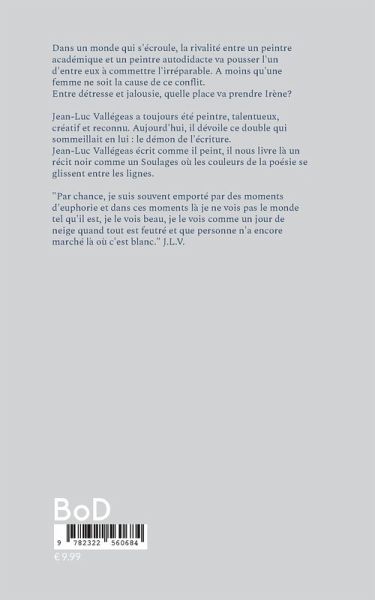 Jean-Luc Vallégeas, a toujours été peintre, talentueux, créatif et reconnu. Il vend ses toiles dans les galeries et les salons. Aujourd'hui enfin il dévoile ce double qui sommeillait en lui, ce démon de l'écriture. Jean-Luc Vallégeas écrit comme il peint et nous livre là un récit noir comme un Soulages, où les couleurs de la poésie se glissent entre les lignes.