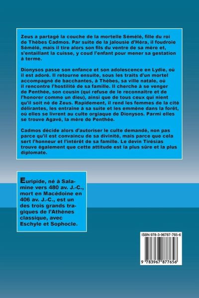Zeus a partagé la couche de la mortelle Sémélé, fille du roi de Thèbes Cadmos. Par suite de la jalousie d'Héra, il foudroie Sémélé, mais il tire alors son fils du ventre de sa mère et, s'entaillant la cuisse, y coud l'enfant pour mener sa gestation à terme. Dionysos passe son enfance et son adolescence en Lydie, où il est adoré. Il retourne ensuite, sous les traits d'un mortel accompagné de bacchantes, à Thèbes, sa ville natale, où il rencontre l'hostilité de sa famille. Il cherche à se venger de Penthée, son cousin (qui refuse de le reconnaître et de l'honorer comme un dieu), ainsi que de tous ceux qui nient qu'il soit né de Zeus. Rapidement, il rend les femmes de la cité délirantes, les entraîne à sa suite et les emmène dans la forêt, où elles se livrent au culte orgiaque de Dionysos. Parmi elles se trouve Agavé, la mère de Penthée. Cadmos décide alors d'autoriser le culte demandé, non pas parce qu'il est convaincu de sa divinité, mais parce que cela sert l'honneur et l'intérêt de sa famille. Le devin Tirésias trouve également que cette attitude est la plus sûre et la plus diplomate.