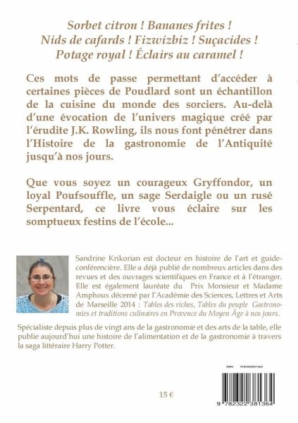 Sorbet citron ! Bananes frites ! Nids de cafards ! Fizwizbiz ! Suçacides ! Potage royal ! Éclairs au caramel !Ces mots de passe permettant d'accéder à certaines pièces de Poudlard sont un échantillon de la cuisine du monde des sorciers. Au-delà d'une évocation de l'univers magique créé par l'érudite J.K. Rowling, ils nous font pénétrer dans l'Histoire de la gastronomie de l'Antiquité jusqu'à nos jours.Que vous soyez un courageux Gryffondor, un loyal Poufsouffle, un sage Serdaigle ou un rusé Serpentard, ce livre vous éclaire sur les somptueux festins de l'école...