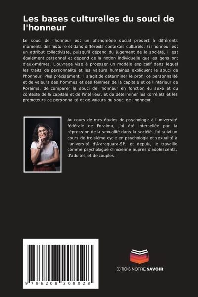 Le souci de l'honneur est un phénomène social présent à différents moments de l'histoire et dans différents contextes culturels. Si l'honneur est un attribut collectiviste, puisqu'il dépend du jugement de la société, il est également personnel et dépend de la notion individuelle que les gens ont d'eux-mêmes. L'ouvrage vise à proposer un modèle explicatif dans lequel les traits de personnalité et les valeurs humaines expliquent le souci de l'honneur. Plus précisément, il s'agit de déterminer le profil de personnalité et de valeurs des hommes et des femmes de la capitale et de l'intérieur de Roraima, de comparer le souci de l'honneur en fonction du sexe et du contexte de la capitale et de l'intérieur, et de déterminer les corrélats et les prédicteurs de personnalité et de valeurs du souci de l'honneur.