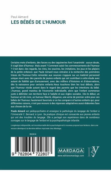 Certains mots d'enfants, des farces ou des taquineries font l'unanimité : aucun doute, il s'agit bien d'humour. Mais avant ? Comment saisir les commencements de l'humour ? C'est dans "les regards, les rires, les sourires, les imitations, les jeux et les plaisirs de la petite enfance" que Paule Aimard nous entraîne à la recherche des premières trâces de l'humour.//Cette remontée aux sources s'appuie sur un matériel personnel unique réuni avec des parents de jeunes enfants qui ont contribué à cette étude avec autant de fidélité que d'amusement, avec des milliers d'histoires et d'observations, dès la naissance pour certains enfants.//Nous touchons bien les tout débuts, alors que l'humour réside autant dans le regard des parents que les intentions du bébé. L'humour, grand manitou de l'économie individuelle, alors que l'enfant commence juste à délimiter son territoire face à l'adulte et aux règles sociales. Dès le début, un humour-art de vivre, un humour-liberté, élégance, une arme de premier ordre pour ces bébés de l'humour, hautement favorisés si on les compare à d'autres enfants qui, pour différentes raisons, n'ont pas recours à des réponses adaptatives aussi élaborées face aux choses de la vie. Paule Aimard est pédopsychiatre et enseigne la pathologie du langage de l¿enfant à l¿Université C. Bernard, à Lyon. Sa pratique clinique est consacrée aux jeunes enfants qui ont des troubles du langage. Elle a partagé son expérience dans de nombreux ouvrages sur le langage de l¿enfant et la psychopathologie infantile.