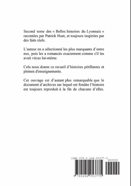 Saviez-vous que cette bonne ville de Lyon (ainsi que toute sa région jusqu'à Saint-Étienne) regorge de faits insolites, parfois d'une drôlerie extravagante, d'autres plus émouvants ou historiques, et quelques-uns tout à fait romanesques, mais toujours évocateurs d'un certain esprit lyonnais ? Patrick Huet a recensé un certain nombre de ces faits puis les a romancés exactement comme s'il les avait vécus lui-même. Cela nous donne ce recueil de petites histoires pétillantes et pleines d'enseignements. Du curieux, de l'amusant, de l'insolite !