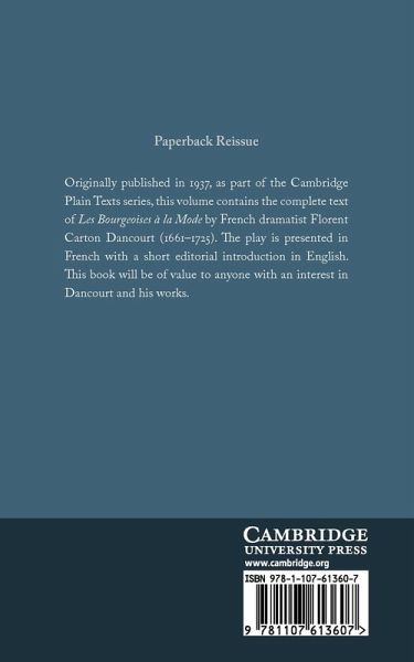 Originally published in 1937 as part of the Cambridge Plain Texts series, this volume contains the complete text of Les bourgeoises a la mode by French dramatist Florent Carton Dancourt (1661-1725). The play is presented in French with a short editorial introduction in English. This book will be of value to anyone with an interest in Dancourt and his works.