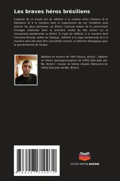L'objectif de ce travail est de réfléchir à la relation entre l'histoire et la littérature et à la manière dont la suppression de ces frontières peut éclairer les deux domaines. Le thème s'articule autour de la construction d'images (réalisées dans la première moitié du XXe siècle) sur le mouvement bandeirante au Brésil. Il s'agit de réfléchir à la manière dont Cassiano Ricardo, poète de l'époque, réfléchit à la saga bandeirante et à la manière dont elle peut être considérée comme un élément idéologique pour le gouvernement de Vargas.