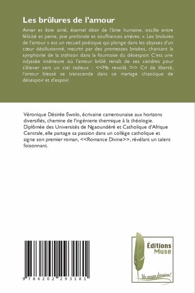 Aimer et être aimé, éternel désir de l'âme humaine, oscille entre félicité et peine, joie profonde et souffrances amères. « Les brulures de l'amour » est un recueil poétique qui plonge dans les abysses d'un coeur désillusionné, meurtri par des promesses brisées, chantant la symphonie de la trahison dans la fournaise du désespoir. C'est une odyssée intérieure où l'amour brûlé renaît de ses cendres pour s'élever vers un ciel radieux : Cri de liberté, l'amour blessé se transcende dans ce mariage chaotique de désespoir et d'espoir.
