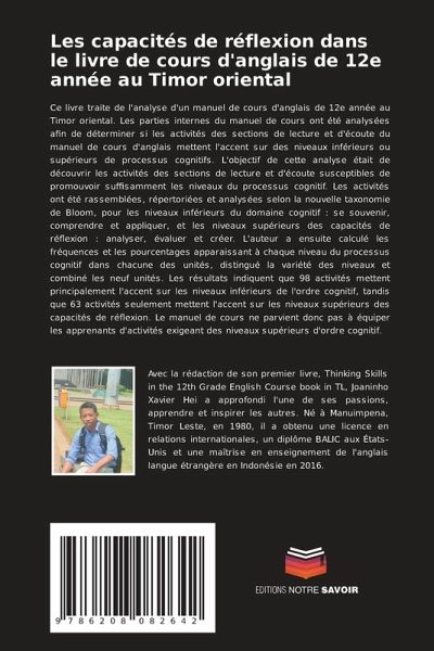 Ce livre traite de l'analyse d'un manuel de cours d'anglais de 12e année au Timor oriental. Les parties internes du manuel de cours ont été analysées afin de déterminer si les activités des sections de lecture et d'écoute du manuel de cours d'anglais mettent l'accent sur des niveaux inférieurs ou supérieurs de processus cognitifs. L'objectif de cette analyse était de découvrir les activités des sections de lecture et d'écoute susceptibles de promouvoir suffisamment les niveaux du processus cognitif. Les activités ont été rassemblées, répertoriées et analysées selon la nouvelle taxonomie de Bloom, pour les niveaux inférieurs du domaine cognitif : se souvenir, comprendre et appliquer, et les niveaux supérieurs des capacités de réflexion : analyser, évaluer et créer. L'auteur a ensuite calculé les fréquences et les pourcentages apparaissant à chaque niveau du processus cognitif dans chacune des unités, distingué la variété des niveaux et combiné les neuf unités. Les résultats indiquent que 98 activités mettent principalement l'accent sur les niveaux inférieurs de l'ordre cognitif, tandis que 63 activités seulement mettent l'accent sur les niveaux supérieurs des capacités de réflexion. Le manuel de cours ne parvient donc pas à équiper les apprenants d'activités exigeant des niveaux supérieurs d'ordre cognitif.