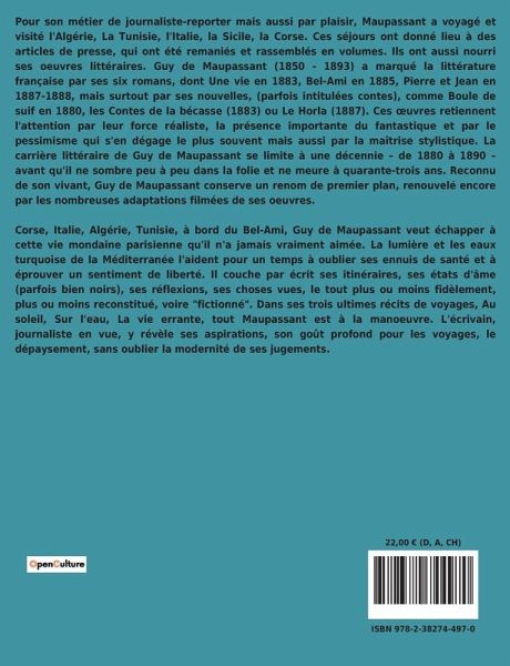 Pour son métier de journaliste-reporter mais aussi par plaisir, Maupassant a voyagé et visité l'Algérie, La Tunisie, l'Italie, la Sicile, la Corse. Ces séjours ont donné lieu à des articles de presse, qui ont été remaniés et rassemblés en volumes. Ils ont aussi nourri ses oeuvres littéraires. Guy de Maupassant (1850 - 1893) a marqué la littérature française par ses six romans, dont Une vie en 1883, Bel-Ami en 1885, Pierre et Jean en 1887-1888, mais surtout par ses nouvelles, (parfois intitulées contes), comme Boule de suif en 1880, les Contes de la bécasse (1883) ou Le Horla (1887). Ces ¿uvres retiennent l'attention par leur force réaliste, la présence importante du fantastique et par le pessimisme qui s'en dégage le plus souvent mais aussi par la maîtrise stylistique. La carrière littéraire de Guy de Maupassant se limite à une décennie ¿ de 1880 à 1890 ¿ avant qu'il ne sombre peu à peu dans la folie et ne meure à quarante-trois ans. Reconnu de son vivant, Guy de Maupassant conserve un renom de premier plan, renouvelé encore par les nombreuses adaptations filmées de ses oeuvres. Corse, Italie, Algérie, Tunisie, à bord du Bel-Ami, Guy de Maupassant veut échapper à cette vie mondaine parisienne qu'il n'a jamais vraiment aimée. La lumière et les eaux turquoise de la Méditerranée l'aident pour un temps à oublier ses ennuis de santé et à éprouver un sentiment de liberté. Il couche par écrit ses itinéraires, ses états d'âme (parfois bien noirs), ses réflexions, ses choses vues, le tout plus ou moins fidèlement, plus ou moins reconstitué, voire "fictionné". Dans ses trois ultimes récits de voyages, Au soleil, Sur l'eau, La vie errante, tout Maupassant est à la manoeuvre. L'écrivain, journaliste en vue, y révèle ses aspirations, son goût profond pour les voyages, le dépaysement, sans oublier la modernité de ses jugements.