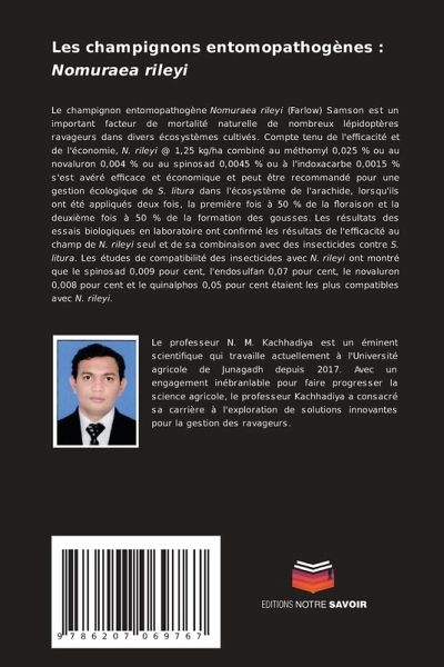 Le champignon entomopathogène Nomuraea rileyi (Farlow) Samson est un important facteur de mortalité naturelle de nombreux lépidoptères ravageurs dans divers écosystèmes cultivés. Compte tenu de l'efficacité et de l'économie, N. rileyi @ 1,25 kg/ha combiné au méthomyl 0,025 % ou au novaluron 0,004 % ou au spinosad 0,0045 % ou à l'indoxacarbe 0,0015 % s'est avéré efficace et économique et peut être recommandé pour une gestion écologique de S. litura dans l'écosystème de l'arachide, lorsqu'ils ont été appliqués deux fois, la première fois à 50 % de la floraison et la deuxième fois à 50 % de la formation des gousses. Les résultats des essais biologiques en laboratoire ont confirmé les résultats de l'efficacité au champ de N. rileyi seul et de sa combinaison avec des insecticides contre S. litura. Les études de compatibilité des insecticides avec N. rileyi ont montré que le spinosad 0,009 pour cent, l'endosulfan 0,07 pour cent, le novaluron 0,008 pour cent et le quinalphos 0,05 pour cent étaient les plus compatibles avec N. rileyi.