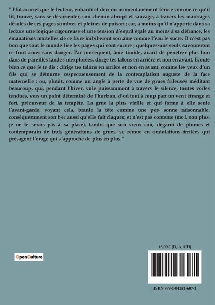 Entrez dans le monde onirique et sombre des "Chants de Maldoror" du Comte de Lautréamont. Cet ¿uvre unique et provocante est un éblouissant mélange de poésie surréaliste et de romantisme noir, qui explore les recoins les plus sombres et les plus dérangeants de l'âme humaine. "Les Chants de Maldoror" racontent l'histoire de Maldoror, une entité maléfique qui rejette les normes sociales et morales et qui se complaît dans l'horreur et la cruauté. À travers une série de chants lyriques, Lautréamont dépeint un monde où la beauté et la laideur, le bien et le mal, se mêlent et se confondent de manière hallucinatoire. L'¿uvre de Lautréamont se distingue par son utilisation audacieuse de l'imaginaire surréaliste et sa représentation sans compromis de la noirceur de l'existence. Ses visions fantastiques et grotesques, mêlées à une poésie profonde et complexe, créent une expérience littéraire inoubliable qui déstabilise, intrigue et fascine. "Les Chants de Maldoror" est un monument de la littérature surréaliste et un chef-d'¿uvre de l'exploration de la condition humaine. C'est une lecture essentielle pour tous ceux qui sont captivés par le surréalisme, la poésie et l'exploration audacieuse des profondeurs de l'âme humaine. Mots-clés : Comte de Lautréamont, Les Chants de Maldoror, poésie surréaliste, romantisme noir, exploration de l'âme humaine, transgression, moralité, beauté, laideur, bien, mal, surréalisme, condition humaine, littérature française.