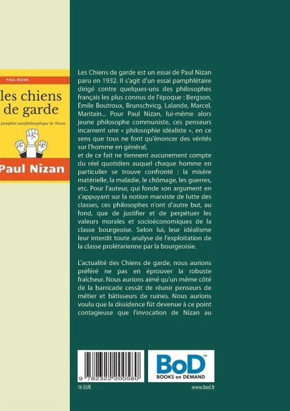 Les Chiens de garde est un essai de Paul Nizan paru en 1932. Il s'agit d'un essai pamphlétaire dirigé contre quelques-uns des philosophes français les plus connus de l'époque : Bergson, Émile Boutroux, Brunschvicg, Lalande, Marcel, Maritain... Pour Paul Nizan, lui-même alors jeune philosophe communiste, ces penseurs incarnent une « philosophie idéaliste », en ce sens que tous ne font qu'énoncer des vérités sur l'homme en général,et de ce fait ne tiennent aucunement compte du réel quotidien auquel chaque homme en particulier se trouve confronté : la misère matérielle, la maladie, le chômage, les guerres, etc. Pour l'auteur, qui fonde son argument en s'appuyant sur la notion marxiste de lutte des classes, ces philosophes n'ont d'autre but, au fond, que de justifier et de perpétuer les valeurs morales et socioéconomiques de la classe bourgeoise. Selon lui, leur idéalisme leur interdit toute analyse de l'exploitation de la classe prolétarienne par la bourgeoisie.L'actualité des Chiens de garde, nous aurions préféré ne pas en éprouver la robuste fraîcheur. Nous aurions aimé qu'un même côté de la barricade cessât de réunir penseurs de métier et bâtisseurs de ruines. Nous aurions voulu que la dissidence fût devenue à ce point contagieuse que l'invocation de Nizan au sursaut et à la résistance en parût presque inutile. Car nous continuons à vouloir un autre monde. L'entreprise nous dépasse ? Notre insuffisance épuise notre persévérance ? Souvenons-nous alors de ce passage par lequel Sartre a résumé l'appel aux armes de son vieux camarade : « Il peut dire aux uns : vous mourez de modestie, osez désirer, soyez insatiables, ne rougissez pas de vouloir la lune : il nous la faut. Et aux autres : dirigez votre rage sur ceux qui l'ont provoquée, n'essayez pas d'échapper à votre mal, cherchez ses causes et cassez-les. »
