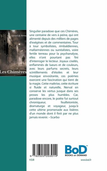 Singulier paradoxe que ces Chimères, une centaine de vers à peine, qui ont alimenté depuis des milliers de pages d'exégèses et de commentaires. Tour à tour symbolistes, rimbaldiennes, mallarméennes ou surréalistes, voire fertile terreau pour la psychanalyse, elles n'ont pourtant pas fini d'interroger le lecteur. Joyaux ciselés, enflammés de lueurs et de couleurs, avec leurs parfums secrets, leurs scintillements d'étoiles et leur musique envoûtante, ces poèmes exercent une fascination qui tient de la magie. Classiques grecs, troubadours, poètes de la Renaissance nourrissent une écriture à la fois limpide et profondément ésotérique. Cette maîtrise, cette écriture si fluide et naturelle, Nerval en conserve les vertus jusque dans ses proses les plus humbles. Car, paradoxe encore, le poète fut surtout chroniqueur, feuilletoniste, dramaturge et voyageur, jusqu'à cette ultime promenade aux lisières d'un monde dont il finit par ne plus jamais revenir. --Scarbo