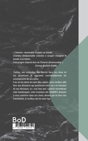« L'homme raisonnable s'adapte au monde. L'homme déraisonnable s'obstine à essayer d'adapter le monde à lui-même.Tout progrès dépend donc de l'homme déraisonnable. » (George Bernard SHAW) Parfois, nos certitudes, nos libertés dans nos choix de vie, accentuent et aggravent considérablement les conséquences de nos actes.Il en est de même de notre libre arbitre, notre meilleur alibi face aux désastres qui parsèment notre vie à la fantaisie de nos décisions, ce « vrai faux ami » parfois encombrant voire handicapant, cette invention des HOMMES destinée à nous conforter dans nos choix, devenu par la force des événements, le meilleur ami de notre Ego.