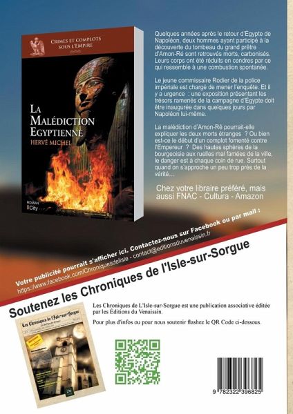 Dans ce nouveau numéro des Chroniques de L'Isle-sur-Sorgue, retrouvez les enquêtes de Jules Monier, ancien commissaire de la Sûreté parisienne, devenu pêcheur de Sorgue dans la jolie ville de L'Isle-sur-la-Sorgue, dans le Vaucluse.Au XIXe siècle, au bord des eaux limpides de la célèbre rivière, le crime ne chôme pas et les gendarmes locaux apprécient (plus ou moins) l'expérience de l'ex-enquêteur.Cette fois, un crime incroyable a été commis. Un acteur est mort sur scène, devant deux cents spectateurs et personne n'a rien vu. Mais le plus inimaginable arrive lorsque le médecin légiste révèle que l'acteur est en réalité mort... noyé.Si l'histoire est une fiction, l'environnement est authentique.Alors si vous aussi, voulez enquêter dans les ruelles étroites et mystérieuses de l'ancienne Venise du Comtat, telle qu'elle était il y a plus d'un siècle, ne manquez pas ce numéro.Vous y découvrirez également des pages historiques, en relation avec le thème du roman.