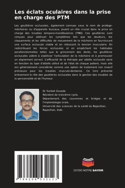 Les gouttières occlusales, également connues sous le nom de protège-mâchoires ou d'appareils buccaux, jouent un rôle crucial dans la prise en charge des troubles temporo-mandibulaires (TMD). Ces gouttières sont conçues pour atténuer les symptômes tels que les douleurs, les claquements et les difficultés de mouvement de la mâchoire en fournissant une surface occlusale stable et en réduisant la tension musculaire. En redistribuant les forces occlusales et en empêchant les habitudes parafonctionnelles telles que le grincement des dents, les gouttières occlusales aident à stabiliser l'articulation de la mâchoire et à promouvoir un alignement correct. L'efficacité de la thérapie par attelle occlusale varie en fonction du type d'attelle utilisé et de l'état de chaque patient, mais elle est généralement considérée comme une option de traitement non invasif précieuse pour les troubles musculo-dentaires. Ce livre présente brièvement le rôle des gouttières occlusales dans la gestion des troubles de la personnalité et de l'humeur.