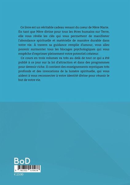 Dans ce livre, Mère Marie, en tant que Mère divine pour les êtres humains sur Terre, vous révèle les clés qui vous permettent de manifester l abondance spirituelle et matérielle de manière durable dans votre vie. A travers sa guidance remplie d amour, vous allez pouvoir surmonter tous les blocages psychologiques qui vous empêchent d exprimer pleinement votre potentiel créateur. Ce cours en trois volumes va très au delà de tout ce qui a été publié à ce jour sur la loi d attraction et dans des programmes pour devenir riche. Il contient des enseignements mystiques profonds et des invocations de la lumière spirituelle, qui vous aident à vous reconnecter à votre identité divine pour réussir le but de votre vie.