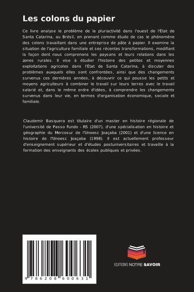Ce livre analyse le problème de la pluriactivité dans l'ouest de l'État de Santa Catarina, au Brésil, en prenant comme étude de cas le phénomène des colons travaillant dans une entreprise de pâte à papier. Il examine la situation de l'agriculture familiale et ses récentes transformations, modifiant la façon dont nous comprenons les paysans et leurs relations dans les zones rurales. Il vise à étudier l'histoire des petites et moyennes exploitations agricoles dans l'État de Santa Catarina, à discuter des problèmes auxquels elles sont confrontées, ainsi que des changements survenus ces dernières années, à découvrir ce qui pousse les petits et moyens agriculteurs à combiner le travail sur leurs terres avec le travail salarié et, dans le même ordre d'idées, à comprendre les changements survenus dans leur vie, en termes d'organisation économique, sociale et familiale.