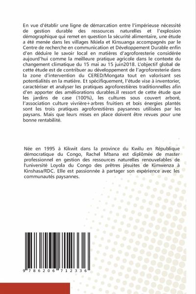 En vue d'établir une ligne de démarcation entre l'impérieuse nécessité de gestion durable des ressources naturelles et l'explosion démographique qui remet en question la sécurité alimentaire, une étude a été menée dans les villages Nkiela et Kinsuanga accompagnés par le Centre de recherche en communication et Développement Durable enfin d'en déduire le savoir local en matières d'agroforesterie considérée aujourd'hui comme la meilleure pratique agricole dans le contexte du changement climatique du 15 mai au 15 juin2018. L'objectif global de cette étude est de contribuer au développement de l'agroforesterie dans la zone d'intervention du CERED/Mongata tout en valorisant ses potentialités en la matière. Et spécifiquement, l'étude vise à inventorier, caractériser et analyser les pratiques agroforestières traditionnelles afin d'en apporter des améliorations durables.il ressort de cette étude que les jardins de case (100%), les cultures sous couvert arboré, l'association culture vivrière+arbres fruitiers et bois énergies plantés sont les trois pratiques agroforestières paysannes utilisées par les paysans. Mais que leurs mises en place doivent être revues pour une bonne rentabilité.