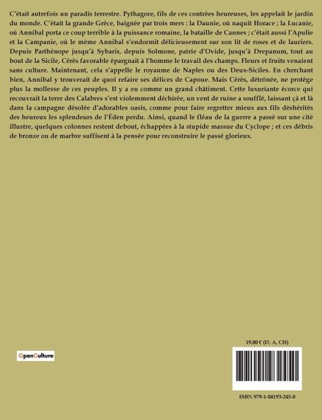 C¿était autrefois un paradis terrestre. Pythagore, fils de ces contrées heureuses, les appelait le jardin du monde. C¿était la grande Grèce, baignée par trois mers : la Daunie, où naquit Horace ; la Lucanie, où Annibal porta ce coup terrible à la puissance romaine, la bataille de Cannes ; c¿était aussi l¿Apulie et la Campanie, où le même Annibal s¿endormit délicieusement sur son lit de roses et de lauriers. Depuis Parthénope jusqüà Sybaris, depuis Solmone, patrie d¿Ovide, jusqüà Drepanum, tout au bout de la Sicile, Cérès favorable épargnait à l¿homme le travail des champs. Fleurs et fruits venaient sans culture. Maintenant, cela s¿appelle le royaume de Naples ou des Deux-Siciles. En cherchant bien, Annibal y trouverait de quoi refaire ses délices de Capoue. Mais Cérès, détrônée, ne protège plus la mollesse de ces peuples. Il y a eu comme un grand châtiment. Cette luxuriante écorce qui recouvrait la terre des Calabres s¿est violemment déchirée, un vent de ruine a soufflé, laissant çà et là dans la campagne désolée d¿adorables oasis, comme pour faire regretter mieux aux fils déshérités des heureux les splendeurs de l¿Éden perdu. Ainsi, quand le fléau de la guerre a passé sur une cité illustre, quelques colonnes restent debout, échappées à la stupide massue du Cyclope ; et ces débris de bronze ou de marbre suffisent à la pensée pour reconstruire le passé glorieux.