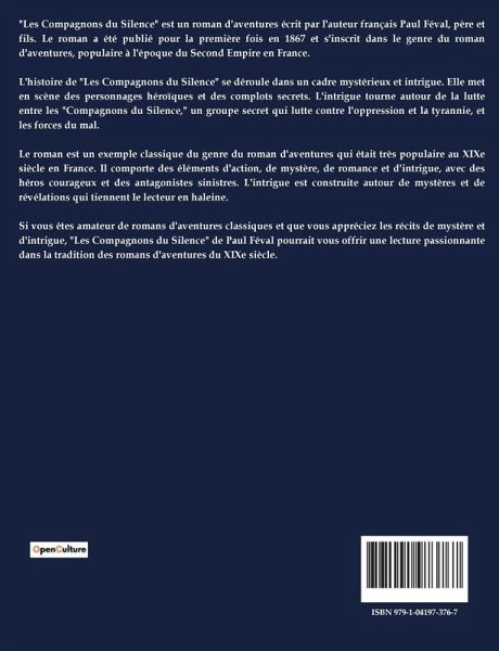 "Les Compagnons du Silence" est un roman d'aventures écrit par l'auteur français Paul Féval, père et fils. Le roman a été publié pour la première fois en 1867 et s'inscrit dans le genre du roman d'aventures, populaire à l'époque du Second Empire en France. L'histoire de "Les Compagnons du Silence" se déroule dans un cadre mystérieux et intrigue. Elle met en scène des personnages héroïques et des complots secrets. L'intrigue tourne autour de la lutte entre les "Compagnons du Silence," un groupe secret qui lutte contre l'oppression et la tyrannie, et les forces du mal. Le roman est un exemple classique du genre du roman d'aventures qui était très populaire au XIXe siècle en France. Il comporte des éléments d'action, de mystère, de romance et d'intrigue, avec des héros courageux et des antagonistes sinistres. L'intrigue est construite autour de mystères et de révélations qui tiennent le lecteur en haleine. Si vous êtes amateur de romans d'aventures classiques et que vous appréciez les récits de mystère et d'intrigue, "Les Compagnons du Silence" de Paul Féval pourrait vous offrir une lecture passionnante dans la tradition des romans d'aventures du XIXe siècle.