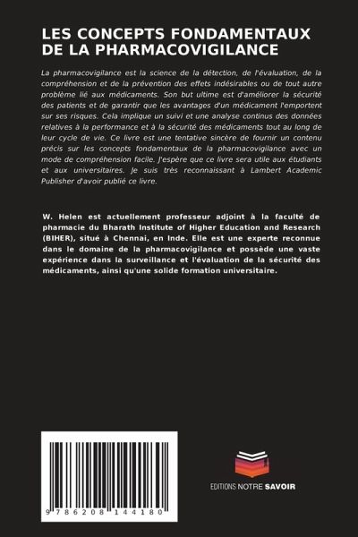 La pharmacovigilance est la science de la détection, de l'évaluation, de la compréhension et de la prévention des effets indésirables ou de tout autre problème lié aux médicaments. Son but ultime est d'améliorer la sécurité des patients et de garantir que les avantages d'un médicament l'emportent sur ses risques. Cela implique un suivi et une analyse continus des données relatives à la performance et à la sécurité des médicaments tout au long de leur cycle de vie. Ce livre est une tentative sincère de fournir un contenu précis sur les concepts fondamentaux de la pharmacovigilance avec un mode de compréhension facile. J'espère que ce livre sera utile aux étudiants et aux universitaires. Je suis très reconnaissant à Lambert Academic Publisher d'avoir publié ce livre.