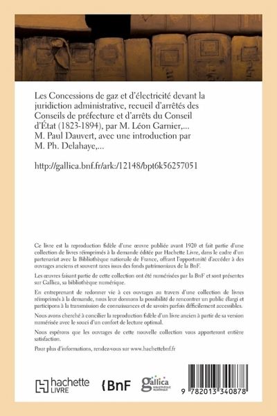 Les Concessions de gaz et d'électricité devant la juridiction administrative, recueil d'arrêtés des Conseils de préfecture et d'arrêts du Conseil d'État (1823-1894), par M. Léon Garnier, ... M. Paul Dauvert, avec une introduction par M. Ph. Delahaye, ... Date de l'édition originale: 1894 Comprend: Introduction Le présent ouvrage s'inscrit dans une politique de conservation patrimoniale des ouvrages de la littérature Française mise en place avec la BNF. HACHETTE LIVRE et la BNF proposent ainsi un catalogue de titres indisponibles, la BNF ayant numérisé ces oeuvres et HACHETTE LIVRE les imprimant à la demande. Certains de ces ouvrages reflètent des courants de pensée caractéristiques de leur époque, mais qui seraient aujourd'hui jugés condamnables. Ils n'en appartiennent pas moins à l'histoire des idées en France et sont susceptibles de présenter un intérêt scientifique ou historique. Le sens de notre démarche éditoriale consiste ainsi à permettre l'accès à ces oeuvres sans pour autant que nous en cautionnions en aucune façon le contenu. Pour plus d'informations, rendez-vous sur www.hachettebnf.fr