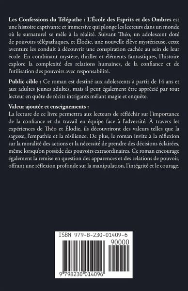 Les Confessions du Télépathe : L'École des Esprits et des Ombres est une histoire captivante et immersive qui plonge les lecteurs dans un monde où le surnaturel se mêle à la réalité. Suivant Théo, un adolescent doté de pouvoirs télépathiques, et Élodie, une nouvelle élève mystérieuse, cette aventure les conduit à découvrir une conspiration cachée au sein de leur école. En combinant mystère, thriller et éléments fantastiques, l'histoire explore la complexité des relations humaines, de la confiance et de l'utilisation des pouvoirs avec responsabilité. Public cible : Ce roman est destiné aux adolescents à partir de 14 ans et aux adultes jeunes adultes, mais il peut également être apprécié par tout lecteur en quête de récits intrigants mêlant magie et enquête. Valeur ajoutée et enseignements : La lecture de ce livre permettra aux lecteurs de réfléchir sur l'importance de la confiance et du travail en équipe face à l'adversité. À travers les expériences de Théo et Élodie, ils découvriront des valeurs telles que la sagesse, l'empathie et la résilience. De plus, le roman invite à la réflexion sur la moralité des actions et la nécessité de prendre des décisions éclairées, même lorsqu'on possède des pouvoirs extraordinaires. Ce roman encourage également la remise en question des apparences et des relations de pouvoir, offrant une réflexion profonde sur la manipulation, l'intégrité et le courage. Plongez dans un monde où les pensées ne sont plus secrètes... Si cette histoire vous a captivé, laissez un avis et partagez votre expérience pour faire rayonner le pouvoir de la lecture !