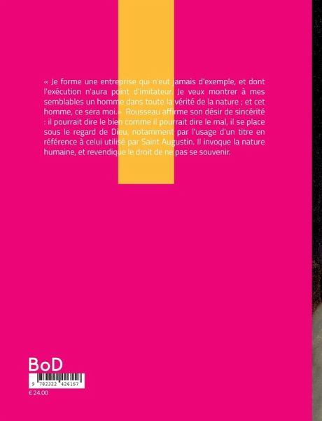 « Je forme une entreprise qui n'eut jamais d'exemple, et dont l'exécution n'aura point d'imitateur. Je veux montrer à mes semblables un homme dans toute la vérité de la nature ; et cet homme, ce sera moi.» Rousseau affirme son désir de sincérité : il pourrait dire le bien comme il pourrait dire le mal, il se place sous le regard de Dieu, notamment par l'usage d'un titre en référence à celui utilisé par Saint Augustin. Il invoque la nature humaine, et revendique le droit de ne pas se souvenir.