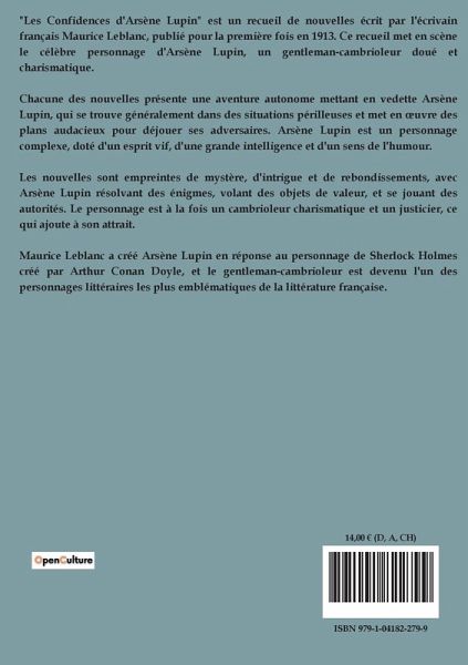 "Les Confidences d'Arsène Lupin" est un recueil de nouvelles écrit par l'écrivain français Maurice Leblanc, publié pour la première fois en 1913. Ce recueil met en scène le célèbre personnage d'Arsène Lupin, un gentleman-cambrioleur doué et charismatique. Chacune des nouvelles présente une aventure autonome mettant en vedette Arsène Lupin, qui se trouve généralement dans des situations périlleuses et met en ¿uvre des plans audacieux pour déjouer ses adversaires. Arsène Lupin est un personnage complexe, doté d'un esprit vif, d'une grande intelligence et d'un sens de l'humour. Les nouvelles sont empreintes de mystère, d'intrigue et de rebondissements, avec Arsène Lupin résolvant des énigmes, volant des objets de valeur, et se jouant des autorités. Le personnage est à la fois un cambrioleur charismatique et un justicier, ce qui ajoute à son attrait. Maurice Leblanc a créé Arsène Lupin en réponse au personnage de Sherlock Holmes créé par Arthur Conan Doyle, et le gentleman-cambrioleur est devenu l'un des personnages littéraires les plus emblématiques de la littérature française.