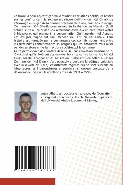 Le travail a pour objectif général d'étudier les relations politiques basées sur les conflits dans la société touarègue Ouillimenden Kel Dinnik de l'Azawagh au Niger, de la période précoloniale à nos jours. Les Touaregs Ouillimenden Kel Dinnik proviennent de la Région de Ménaka (Mali actuel) suite à une dissension intervenue entre eux et leurs frères restés à Menaka et qui prennent la dénomination Ouillimenden Kel Ataram. Les émigrés s'appellent Ouillimenden de l'Est ou Kel Dinnik. Leur histoire est marquée par la permanence des conflits notamment entre les différentes confédérations touarègues qui les entourent mais aussi par des tensions entre les fractions sociales qui la compose. Cette permanence des conflits dépend de leur éducation traditionnelle. C'est ainsi qu'ils livrèrent des grandes batailles contre les Kel Aïr, les Kel Gress, les Kel Ahaggar et les Kel Ataram. Cette attitude belliqueuse des Ouillimenden Kel Dinnik s'est poursuivie pendant la période coloniale avec la révolte de 1917, les différents régimes qui se sont succédé au Niger après les indépendances et pendant le nouveau contexte de la démocratisation avec la rébellion armée de 1991 à 1995.