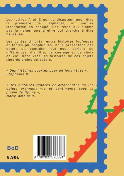 Les lettres A et Z qui se disputent pour être la première de l'alphabet, un sorcier transformé en canapé, une reine qui n'aime pas la neige, une tirelire qui cherche à être heureuse... Les contes timbrés, entre histoires loufoques et fables philosophiques, nous présentent des objets du quotidien qui nous parlent de différences, d'amitié, de courage et de choix de vie. Découvrez les histoires de ces objets timbrés pleins de poésie. "Des histoires courtes pour de jolis rêves", Stéphanie B. "Des histoires tendres et attachantes où les objets prennent vie et sentiments sous la plume de Djinny" Marie-Amélie N.