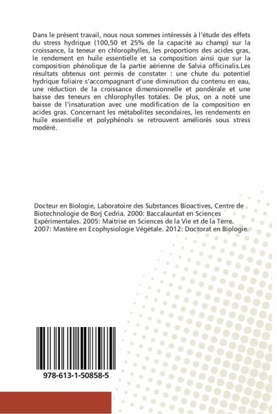 Dans le présent travail, nous nous sommes intéressés à l'étude des effets du stress hydrique (100,50 et 25% de la capacité au champ) sur la croissance, la teneur en chlorophylles, les proportions des acides gras, le rendement en huile essentielle et sa composition ainsi que sur la composition phénolique de la partie aérienne de Salvia officinalis.Les résultats obtenus ont permis de constater : une chute du potentiel hydrique foliaire s'accompagnant d'une diminution du contenu en eau, une réduction de la croissance dimensionnelle et pondérale et une baisse des teneurs en chlorophylles totales. De plus, on a noté une baisse de l'insaturation avec une modification de la composition en acides gras. Concernant les métabolites secondaires, les rendements en huile essentielle et polyphénols se retrouvent améliorés sous stress modéré.