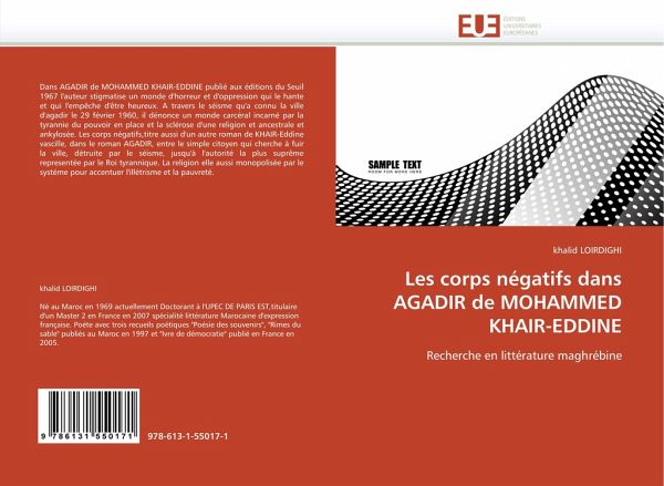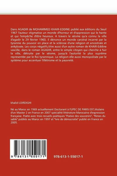 Dans AGADIR de MOHAMMED KHAIR-EDDINE publié aux éditions du Seuil 1967 l'auteur stigmatise un monde d'horreur et d'oppression qui le hante et qui l'empêche d'être heureux. A travers le séisme qu'a connu la ville d'agadir le 29 février 1960, il dénonce un monde carcéral incarné par la tyrannie du pouvoir en place et la sclérose d'une religion et ancestrale et ankylosée. Les corps négatifs,titre aussi d'un autre roman de KHAIR-Eddine vascille, dans le roman AGADIR, entre le simple citoyen qui cherche à fuir la ville, détruite par le séisme, jusqu'à l'autorité la plus suprême representée par le Roi tyrannique. La religion elle aussi monopolisée par le systéme pour accentuer l'illétrisme et la pauvreté.