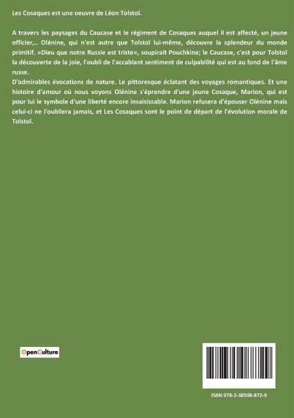 Les vastes plaines de la Russie du XIXe siècle servent de toile de fond à l'uvre magistrale de Léon Tolstoï, ' Les Cosaques: L'intégrale '. Ce récit nous plonge dans le quotidien des Cosaques, ces guerriers libres et fiers, vivant en marge de la société russe. À travers les yeux d'Olenine, un jeune aristocrate moscovite en quête de sens, le lecteur découvre un monde où les traditions ancestrales et la nature sauvage dictent la vie quotidienne. Olenine, désabusé par la vie citadine et ses faux-semblants, cherche à se réinventer au contact de cette communauté singulière. L'uvre explore les tensions entre la civilisation et la nature, entre le devoir et le désir, et entre l'individu et la collectivité. Tolstoï dépeint avec une précision exceptionnelle les paysages caucasiens, tout en sondant les profondeurs de l'âme humaine. Les Cosaques, avec leur mode de vie simple et authentique, incarnent une forme de liberté que le protagoniste aspire à comprendre et à embrasser. Les thèmes de l'amour, de l'honneur et de la quête identitaire sont au cur de cette fresque littéraire. Olenine se retrouve confronté à ses propres contradictions, tiraillé entre son attirance pour la belle Maryanka et son incapacité à renoncer à ses privilèges de noble. Ce dilemme reflète les questionnements universels sur la place de l'homme dans le monde et la recherche d'une existence véritablement épanouissante. En nous immergeant dans cette société cosaque, Tolstoï nous offre une réflexion sur la nature humaine et les choix qui façonnent notre destin. Par son écriture immersive et sa capacité à capturer l'essence des relations humaines, ce livre nous incite à reconsidérer notre propre rapport à la liberté et à l'authenticité.