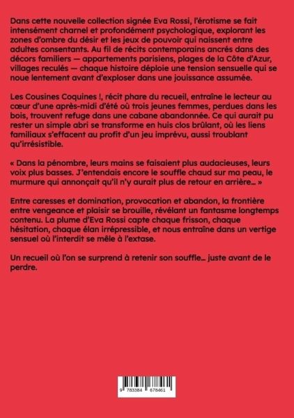 Dans cette nouvelle collection signée Eva Rossi, l'érotisme se fait intensément charnel et profondément psychologique, explorant les zones d'ombre du désir et les jeux de pouvoir qui naissent entre adultes consentants. Au fil de récits contemporains ancrés dans des décors familiers - appartements parisiens, plages de la Côte d'Azur, villages reculés - chaque histoire déploie une tension sensuelle qui se noue lentement avant d'exploser dans une jouissance assumée.Les Cousines Coquines !, récit phare du recueil, entraîne le lecteur au coeur d'une après-midi d'été où trois jeunes femmes, perdues dans les bois, trouvent refuge dans une cabane abandonnée. Ce qui aurait pu rester un simple abri se transforme en huis clos brûlant, où les liens familiaux s'effacent au profit d'un jeu imprévu, aussi troublant qu'irrésistible.« Dans la pénombre, leurs mains se faisaient plus audacieuses, leurs voix plus basses. J'entendais encore le souffle chaud sur ma peau, le murmure qui annonçait qu'iln'y aurait plus de retour en arrière... »Entre caresses et domination, provocation et abandon, la frontière entre vengeance et plaisir se brouille, révélant un fantasme longtemps contenu. La plume d'Eva Rossi capte chaque frisson, chaque hésitation, chaque élan irrépressible, et nous entraîne dans un vertige sensuel où l'interdit se mêle à l'extase.Un recueil où l'on se surprend à retenir son souffle... juste avant de le perdre.
