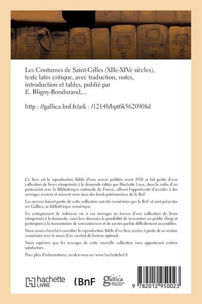 Les Coutumes de Saint-Gilles (XIIe-XIVe siècles), texte latin critique, avec traduction, notes, introduction et tables, publié par E. Bligny-Bondurand, ... Date de l'édition originale: 1915 [Coutume. Saint-Gilles. 1915] Le présent ouvrage s'inscrit dans une politique de conservation patrimoniale des ouvrages de la littérature Française mise en place avec la BNF. HACHETTE LIVRE et la BNF proposent ainsi un catalogue de titres indisponibles, la BNF ayant numérisé ces oeuvres et HACHETTE LIVRE les imprimant à la demande. Certains de ces ouvrages reflètent des courants de pensée caractéristiques de leur époque, mais qui seraient aujourd'hui jugés condamnables. Ils n'en appartiennent pas moins à l'histoire des idées en France et sont susceptibles de présenter un intérêt scientifique ou historique. Le sens de notre démarche éditoriale consiste ainsi à permettre l'accès à ces oeuvres sans pour autant que nous en cautionnions en aucune façon le contenu. Pour plus d'informations, rendez-vous sur www.hachettebnf.fr