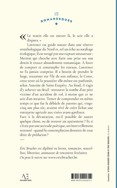 «Le matin elle est encore là, le soir elle a disparu.¿» Lawrence est guide nature dans une réserve ornithologique du Nord et, tel un écho au naufrage écologique, il est ravagé par une rupture amoureuse¿: Meriem qui cherche avec furie une prise sur son destin le trouve absurdement romantique. À force de compter et contempler les oiseaux, Lawrence ne l¿a jamais comprise. Il a besoin de prendre le large, retourner sur l¿île de son enfance, la Corse, cette terre où la poussière elle-même est parfumée, selon Antoine de Saint-Exupéry. Au fond, il s¿agit d¿y achever un deuil¿: retrouver la tombe d¿un père victime d¿un accident de vol, à moins que ce ne soit d¿un meurtre. Tenter de comprendre en même temps ce que fut la débâcle de parents qui, vingt-cinq ans plus tôt, avaient rêvé de créer là-bas une entreprise agricole aux visées avant-gardistes. Face à la dévastation, est-il possible de sauver quelque chose, ou de trouver un apaisement¿? Et si c¿était par une attitude poétique, un émerveillement retrouvé¿: quand la contemplation dessaisit de tout désir de prédation¿? ¿¿ Éric Brucher est diplômé en lettres, romancier, nouvelliste, librettiste, animateur de rencontres littéraires. On peut le suivre sur www.ericbrucher.be