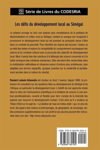 This book is an uncompromising analysis of Senegal's decentralisation policy in rural areas. It discusses the state's inability to promote local development, despite this being its main raison d'être in a context of poverty. To identify reasons for the shortcomings, the author goes beyond policy statements and explores, sociologically, the compatibility of the behaviour and the cultural context of actors with the pursuance of local development objectives. Yet, there are indeed solutions to the actors' lethargy and to the weak coverage of the initiatives undertaken. The solutions can be found in the methodical and civic mobilisation around more ambitious actions that are more adapted to receptive localities, though opened to modernity and perfectly anchored in the culture for positive results. Rosnert Ludovic Alissoutin holds a PhD in Law. Since 1995, he has been working as a consultant on development issues in Senegal and Africa, particularly local development issues. The particularity of his approach lies in the rejection of scientific exclusivism and recourse to a multi disciplinary, open and flexible analysis of the complexity of human development. It is this perspective that informed his doctoral thesis on La Gestion de l'eau en milieu aride, which discusses legal, anthropological, geographical, and sociological issues. For additional information on his profile and work, visit his website: http://www.ralissoutin.com.